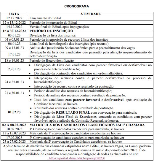 Não haverá prova, e a seleção deverá ocorrer por meio de análise de questionário socioeconômico. O resultado do seletivo deverá ser divulgado no dia 1º de fevereiro de 2023, com período de matrículas dos convocados em primeira chamada de 2 a 8 de fevereiro.